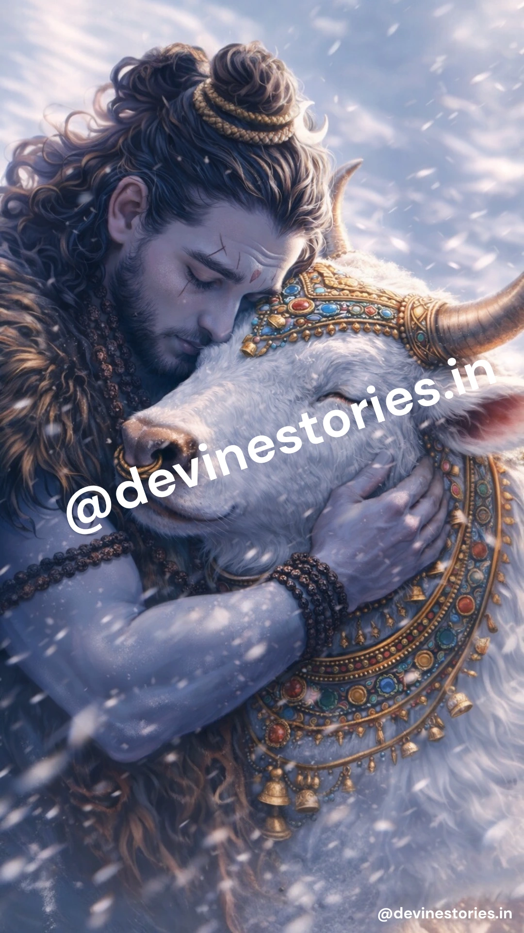 A divine image of Lord Shiva lovingly embracing Nandi, symbolizing compassion, loyalty, and eternal devotion. This spiritual artwork reflects the sacred bond between Mahadev and his beloved vahana , showing peace and divine energy.
